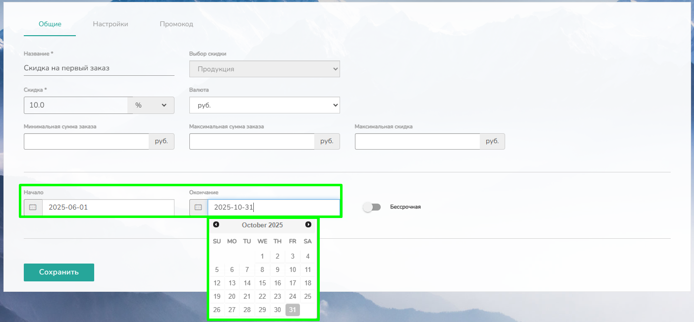 Решена проблема с календарём (datepicker) в разделе скидок. Теперь выбранные даты начала и окончания акций корректно отображаются и сохраняются с первого раза, без ошибок в формате даты.