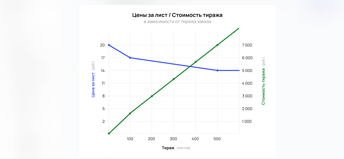 Бумага: 1-99 шт. = 20 руб./лист, 100-499 = 17 руб., 500+ = 14 руб.