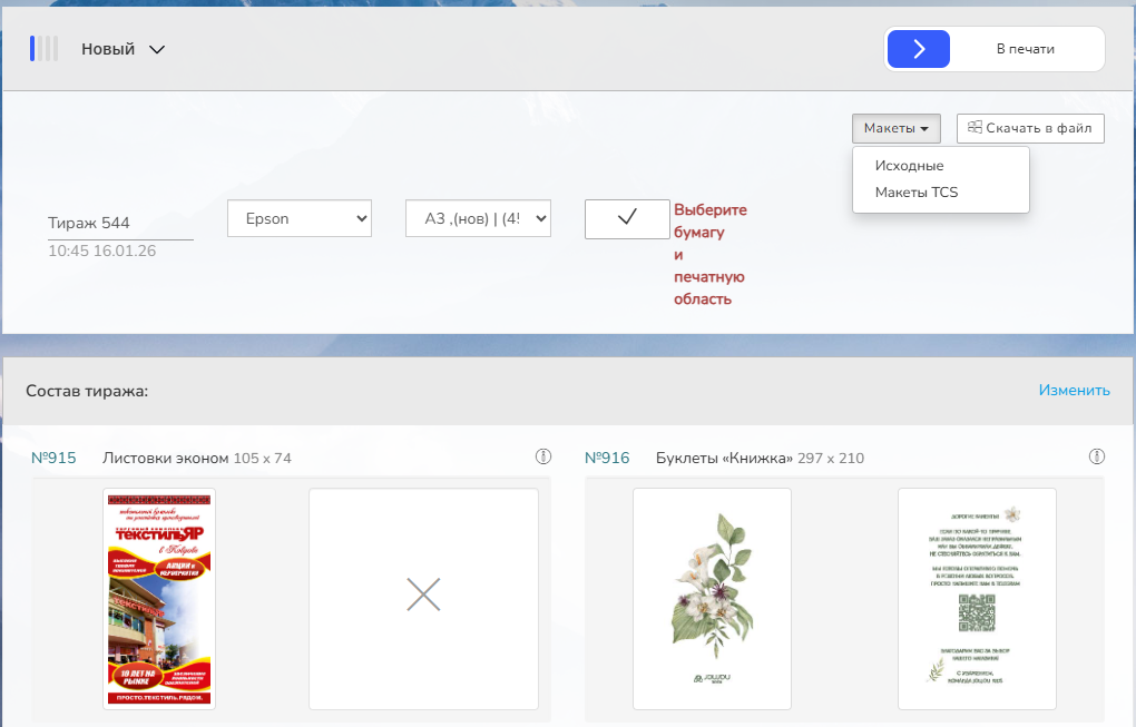 Тираж можно формировать для заказов с оплатой или гарантией оплаты и принятым макетом.