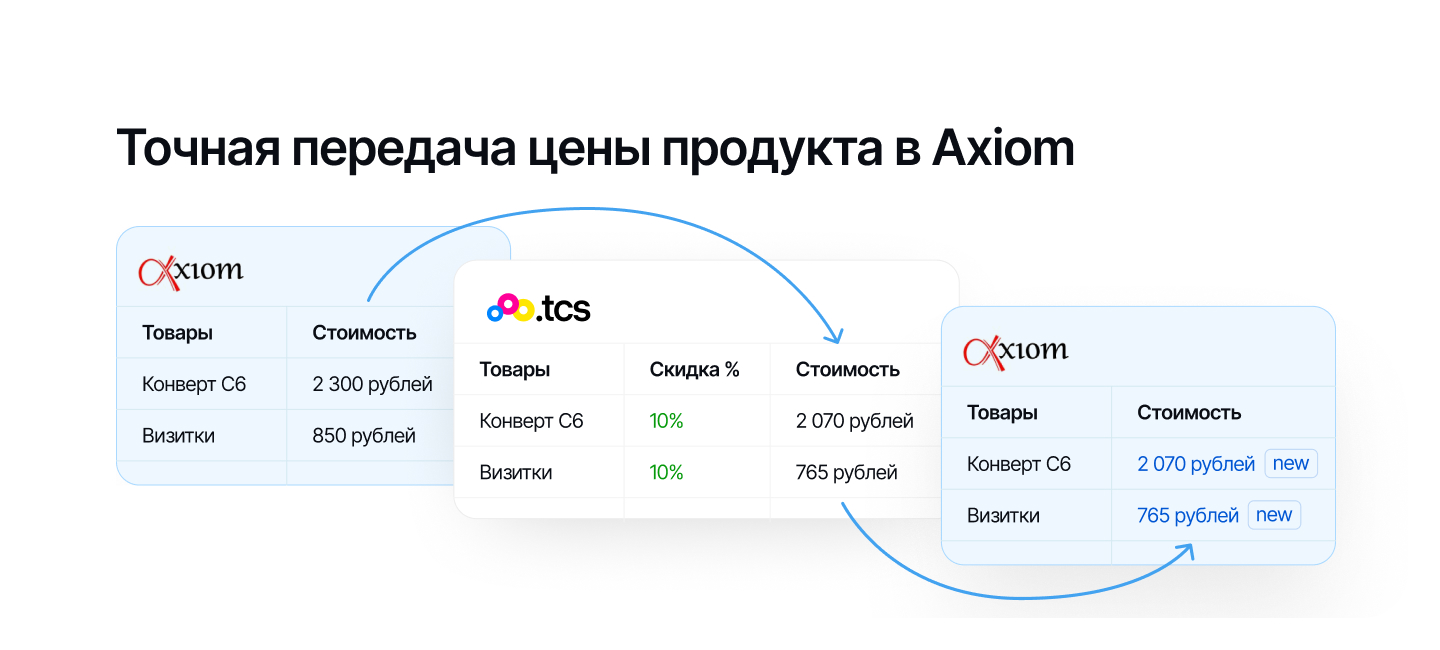 Раньше некоторые наши клиенты сталкивались с проблемой, что при продаже товара на сайте со скидкой или наценкой в АСУП Axiom передавалась первоначальная цена, а не конечная, потому что примененные правила ценообразования на сайте не синхронизировались с АСУП. Это приводило к путанице в отчётности: клиент заказывал товар со скидкой, а в Axiom фиксировалась первоначальная стоимость.